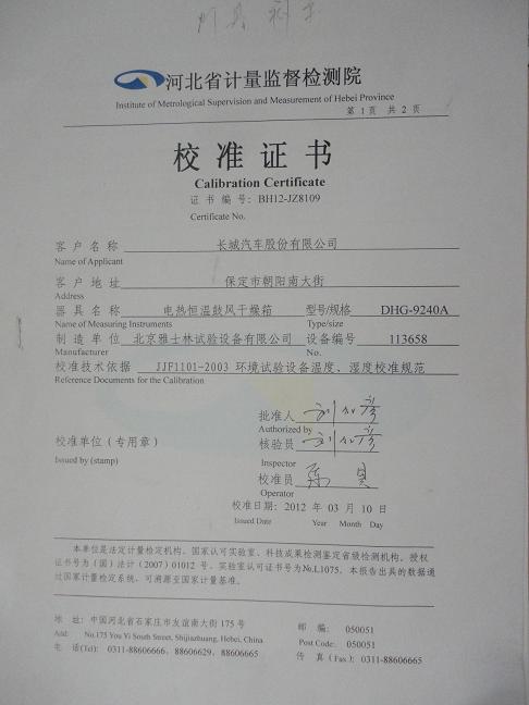 >>電熱恒溫鼓風(fēng)干燥箱校準(zhǔn)證書-河北計(jì)量院-長(zhǎng)城汽車