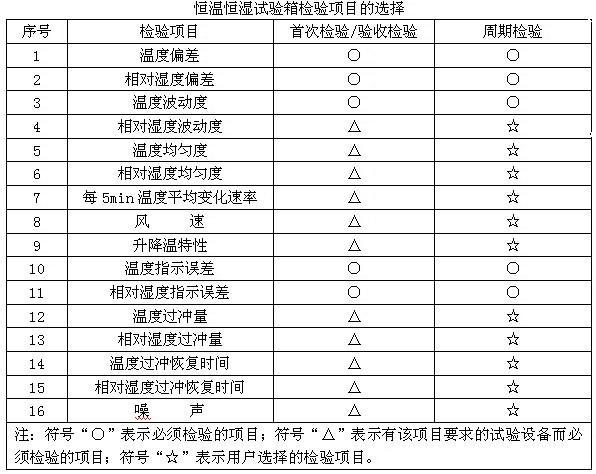 恒溫恒濕試驗箱首次檢驗/驗收檢驗和周期檢驗時,若無其他規(guī)定,按下表選擇檢驗項目。