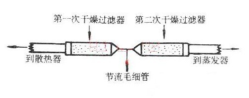 恒溫恒濕試驗(yàn)箱制冷系統(tǒng)在檢修時(shí),由于操作工藝不嚴(yán),往往會(huì)造成制冷系統(tǒng)中的水分不能處理干凈或系統(tǒng)中的空氣排不干凈。這些水分在恒溫恒濕試驗(yàn)箱制冷系統(tǒng)中會(huì)與制冷劑、油反應(yīng)生成氫氟酸和鹽酸,腐蝕各部件、管道和冷凍油,尤其對(duì)鋁制平板式蒸發(fā)器腐蝕更嚴(yán)重。為了徹底解決這一問(wèn)題,完全清除制冷系統(tǒng)中殘余水分,下面為大家介紹兩次過(guò)濾法,具體做法見下圖,在蒸發(fā)器與毛細(xì)管之間增加一個(gè)帶有干燥劑的過(guò)濾器。