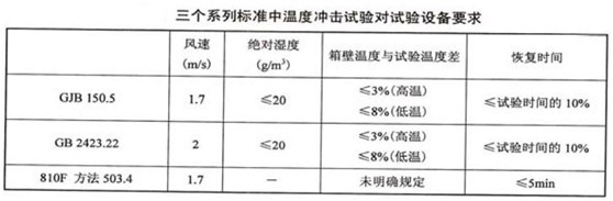 下表中列出了三個(gè)系列標(biāo)準(zhǔn)中溫度沖擊試驗(yàn)對(duì)試驗(yàn)箱的要求,由于都是屬于溫度試驗(yàn)的范疇,因此其對(duì)溫度沖擊試驗(yàn)箱的要求與溫度試驗(yàn)箱的要求類(lèi)似,其主要區(qū)別是增加了溫度沖擊試驗(yàn)中開(kāi)箱放入試驗(yàn)樣品后試驗(yàn)箱內(nèi)空氣溫度恢復(fù)到規(guī)定試驗(yàn)溫度的時(shí)間要求。