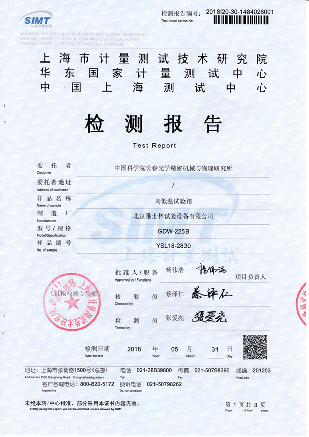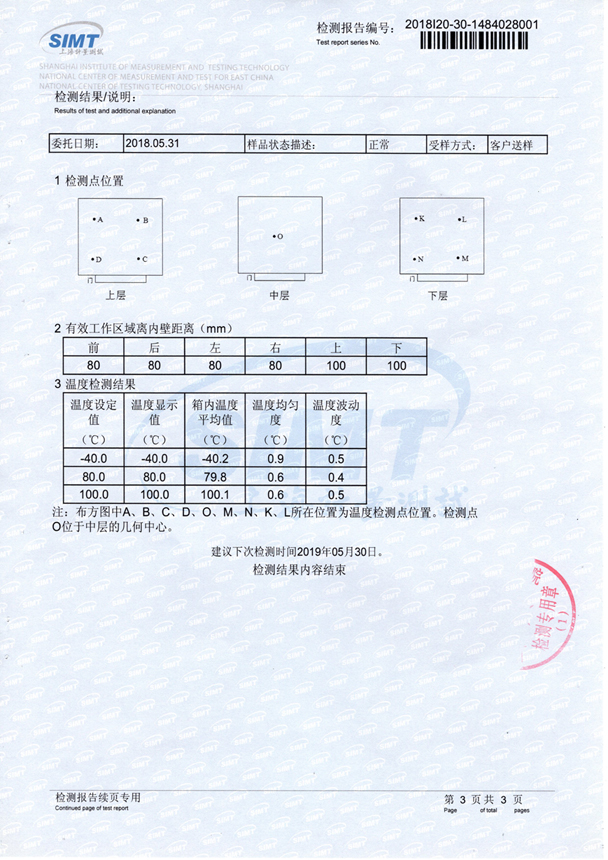 高低溫試驗(yàn)箱在首次投入使用前,應(yīng)對(duì)可反映設(shè)備性能的相關(guān)參數(shù)進(jìn)行詳細(xì)確認(rèn)及測(cè)試,在日常使用中則應(yīng)依據(jù)所使用的試驗(yàn)方法進(jìn)行對(duì)試驗(yàn)參數(shù)的要求,需確認(rèn)其性能是否滿(mǎn)足試驗(yàn)參數(shù)的要求。更多的用戶(hù)會(huì)選擇由第三方檢測(cè)機(jī)構(gòu)進(jìn)行檢測(cè),并出廠(chǎng)檢測(cè)報(bào)告,如下: